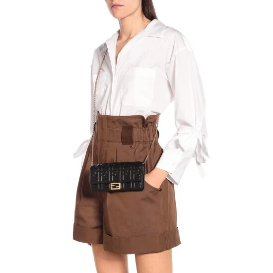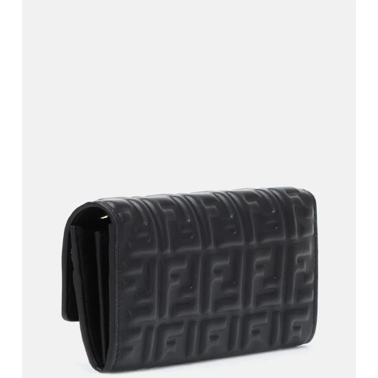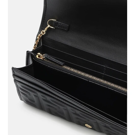 The Baguette Continental leather wallet from Fendi makes an sleek impression with its smooth black calf leather and FF embossing. Finished with glistening golden hardware, which includes an optional chain strap, the interior wallet features two gusseted compartments, a zip pocket, and card slots for maximum functionality.