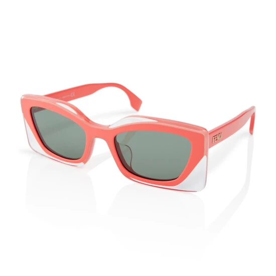 Fendi’s play with proportions results in the Fendi Feel sunglasses. The inner solid-colored cat-eye shape features logo inlays at the temples and is edged with clear acetate that fills out the square frames.