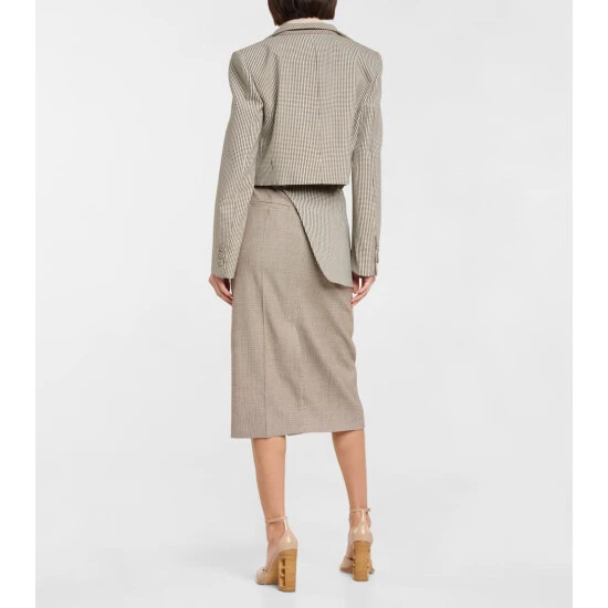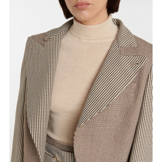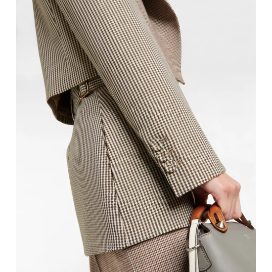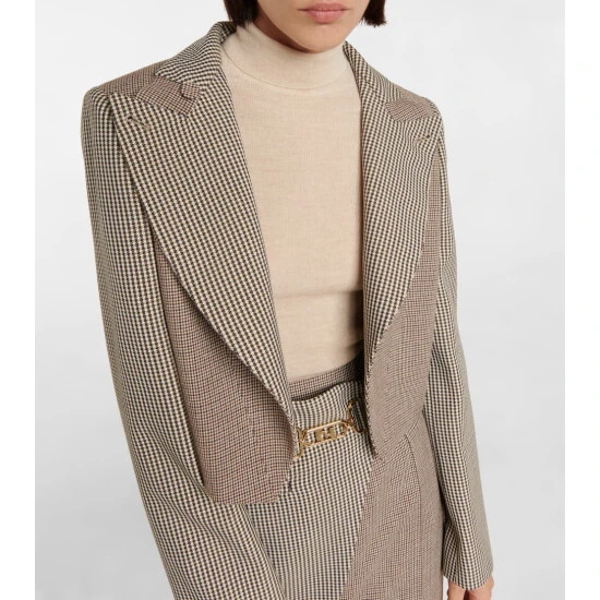Look to this cropped jacket from Fendi for a sophisticated finish to any ensemble. Made from a wool blend with beige houndstooth motif, the bolero-inspired style has a stand collar, single button closure, and a breast pocket.