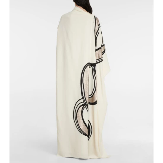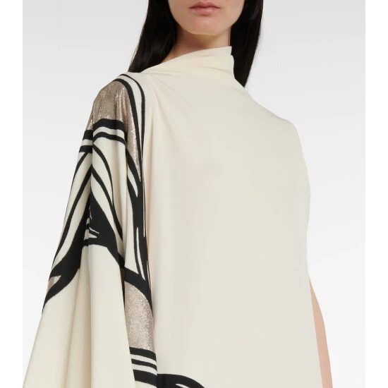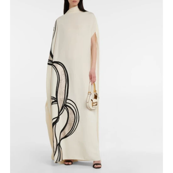 For elegant events, opt for this kaftan-inspired cady gown from Fendi. Cut from a silk blend with metallic thread detailing, this piece features a jacquard design that pays tribute to the fashion illustrator Antonio Lopez.