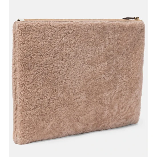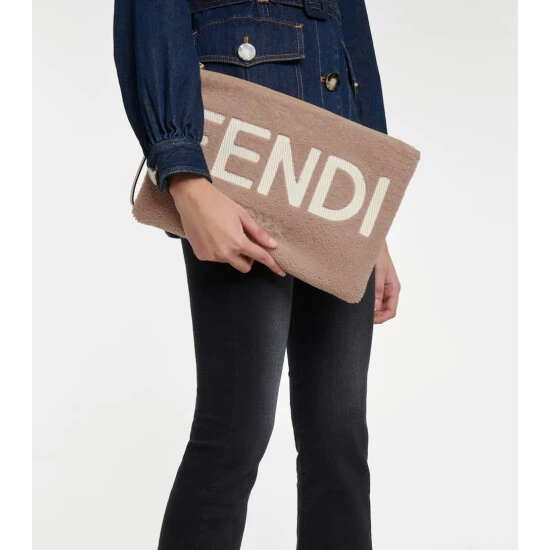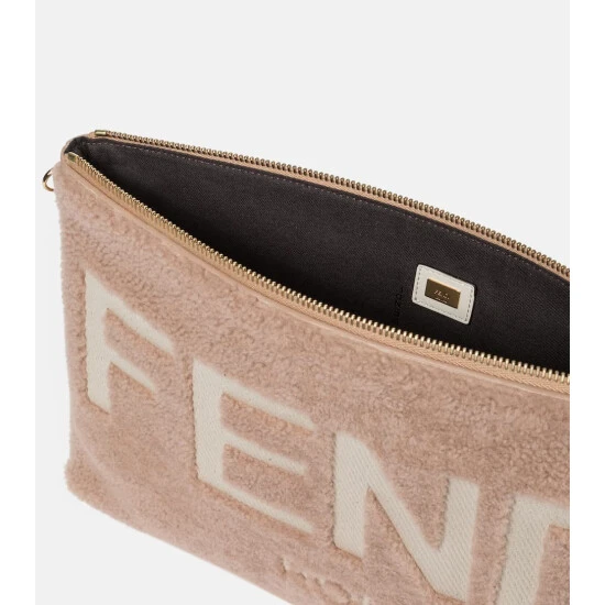 Whether for make-up essentials or for running errands, you’ll find myriad reasons to carry this large beige pouch by Fendi. Made in Italy from shearling with leather trim, it features the Fendi Roma logo embroidered across the front. A convenient detail, the detachable wristlet strap can be used when you need to go hands-free.