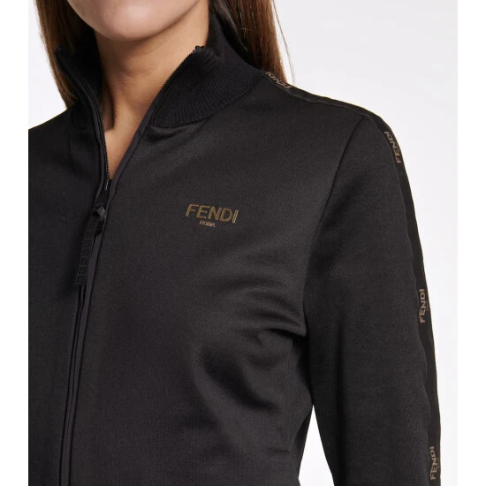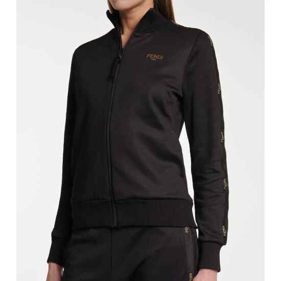 For morning strolls or post-gym coffee runs, consider this black track jacket from Fendi. Golden logo-tape trims, as well as coordinating insignia hotstamped on the chest, bring the house’s signature glamour to this otherwise sporty style. It’s made from soft cotton-blend jersey with insulating ribbed-knit trims.
