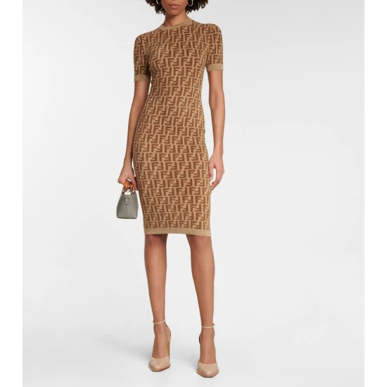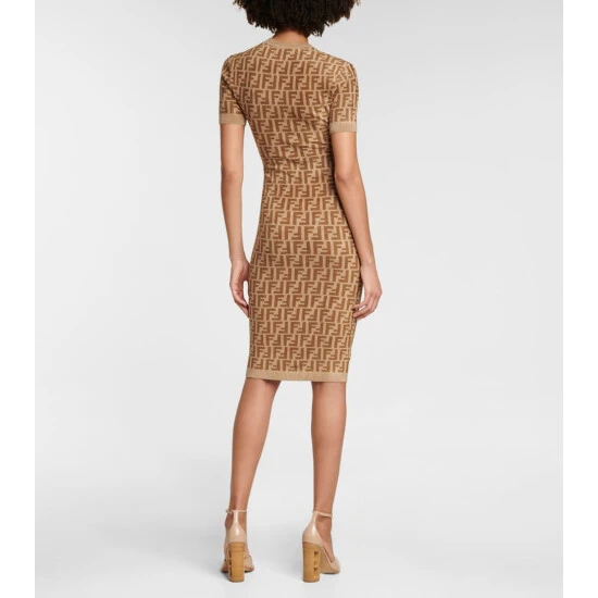 This dress from Fendi is made in Italy in a bodycon silhouette with short sleeves and a round neck. It features an all-over FF monogram pattern with rib detailing on the neckline, cuffs, and hem.