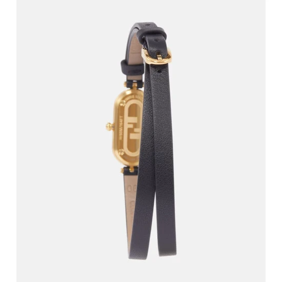 The O’Lock watch from Fendi is made from satin-finished stainless steel in the oval O’Lock motif – an evolution of the FF logo. It has a leather strap and is bezel-set with diamonds on the crown and the sunray-effect face.