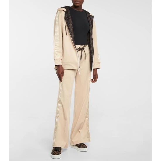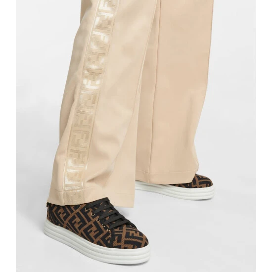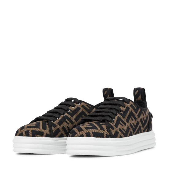 Step up your footwear game, literally, with these tobacco-brown and black Rise sneakers from Fendi. Made form FF-printed mesh, they have a traditional silhouette with ribbed 35mm rubber soles.